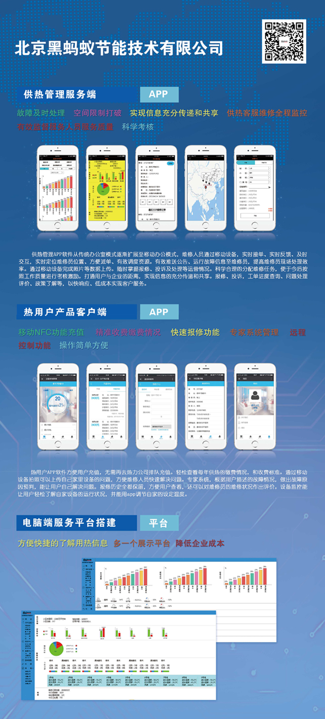 供热管理APP软件从传统办公室模式逐渐扩展至移动办公模式,有效调度资源,随时掌握报修、投诉及处理等运营情况,实现信息充分传递和共享。科学合理的分配维修任务,便于今后按照工作质量进行考核激励。供热客服维修全程监控,有效监督服务人员服务质量。热用户APP软件利用移动NFC功能充值方便用户充值。轻松查看每年供热缴费情况,精准收费缴费情况。快速报修功能方便维修人员快速解决问题。专家系统管理能让用户自己解决问题。操作简单方便。电脑端服务平台的搭建,方便快捷的了解用热信息, 多一个展示平台 ,降低企业成本,实现了移动端,PC端系统一体化管理。
